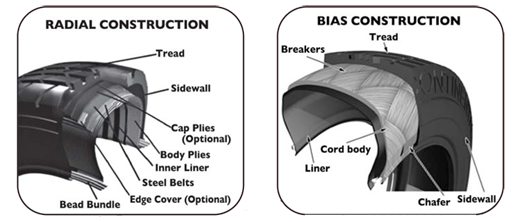 Tyres are classified according to their construction as: 1 – Radial. 2 – Bias or Diagonal or Cross Ply.